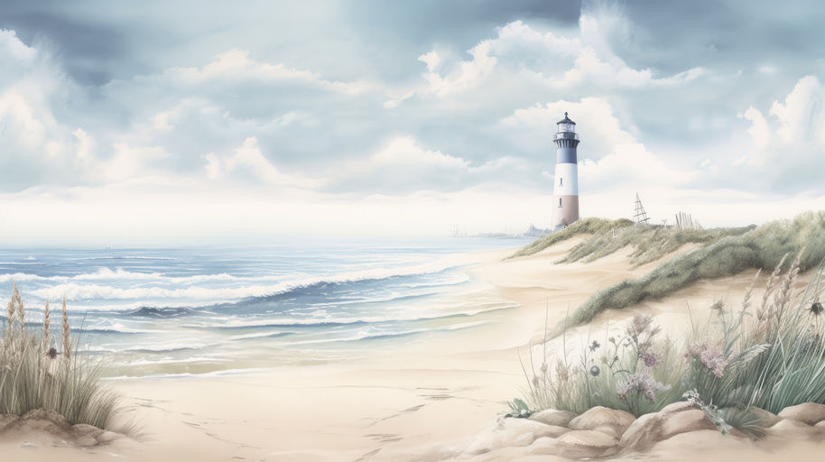 At the center, a lighthouse stands tall, echoing hope and guidance against the backdrop of a pristine sandy beach. As gentle waves lap against the shore, they weave a soothing narrative of calm and balance. The fresco unfolds this narrative in a realistic style with fluid, subtle brushstrokes, and a harmonious color palette of soft blues and gentle neutrals. The warmth of the scene is accentuated by the delicate golden glow, casting comforting shadows and highlights on the sand and water, making 'Saaremaa Lighthouse' an epitome of well-being.